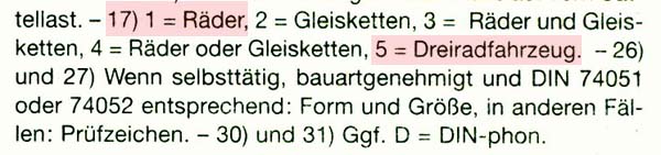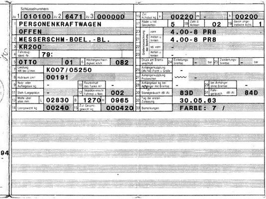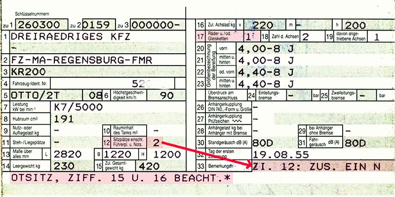Hersteller Schlüssel Typ Schlüssel FZ-Typ (Ziff.2) (Ziff. 3) 6774 REGENSBURGER-ST.-RSM 320 KR175 6774 REGENSBURGER-ST.-RSM 325 KR200 0159 FZ-MA-REGENSBURG-FMR 325 KR200 0159 FZ-MA-REGENSBURG-FMR 326 KR201 0159 FZ-MA-REGENSBURG-FMR 327 Tg500Das stimmt schon eher, aber dafür passt hier die Räderanzahl nicht. Dies sind die richtigen Einträge, dass sie in dieser Liste stehen, hat sicher den Hintergrund, dass Messerschmitt sie damals als Fahrzeugart PKW (01) mit Radantrieb bei der ABE angemeldet hat, der Text im Brief hiess allerdings PKW-Dreirad-Kabinenroller. Die Übernahme in die EDV war ja erst viel später, eine Änderung erfolgte dann sicher nicht mehr. Und wer soll sich beim KBA bei Änderungen der einzelnen Felder um solche "übriggebliebenen" Typen kümmern, wenn es keine Rechtsnachfolger gibt?