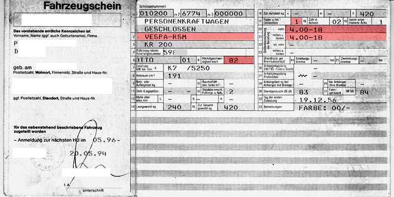Hersteller Schlüssel Typ Schlüssel FZ-Typ (Ziff.2) (Ziff. 3) 6774 VESPA-RSM 901 MESSERSCHMITT DREIRAD 0159 FZ-MA-REGENSBURG-FMR 901 MOKULI 0159 FZ-MA-REGENSBURG-FMR 902 MOKULI 250Die Einträge sind vermutlich falsch, die technischen Daten die noch weiter hinterlegt sind sprechen dafür, dass hier das Mokuli aus RSM-Produktion gemeint ist, da wird das KBA den Hersteller falsch abgespeichert haben. Unter 6774 führt es ja RSM, Vespa und Vespa-RSM, die zwar getrennte GmbH's waren, aber über Messerschmitt wirtschaftlich verbunden waren.