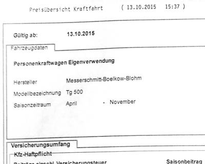 Da ist der Versicherungsvertreter offensichtlich auf eine uralte Messerschmitt-Werbung hereingefallen!